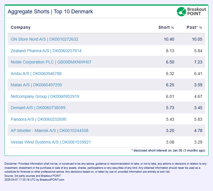 Note: Positions below 0.1% of issued share capital are not required to be reported and are therefore not included in the aggregate disclosed figures.Get our API for the Sweden and Denmark Public Disclosures of Aggregate Sum of Net Short Positions. Contact Breakout Point!