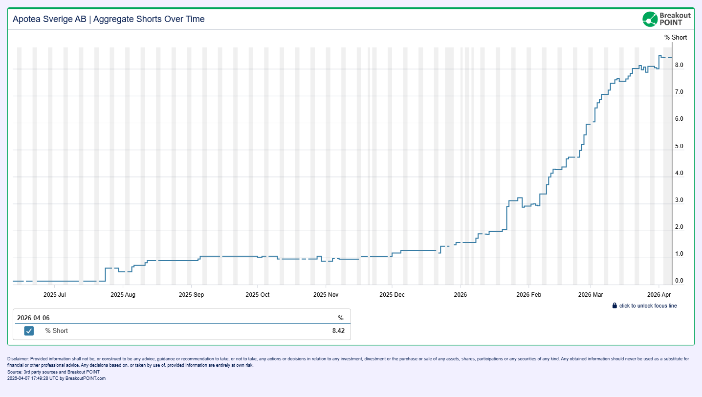 This shows how much of the company's total issued shares are currently held as net short positions, as disclosed via Finansinspektionen (Sweden) or the Danish Financial Supervisory Authority (Denmark). The sum includes all short positions that exceed 0.1 per cent of the issued share capital. Please note that it is not required to report positions below 0.1 per cent, and such positions are therefore not included in the figure.